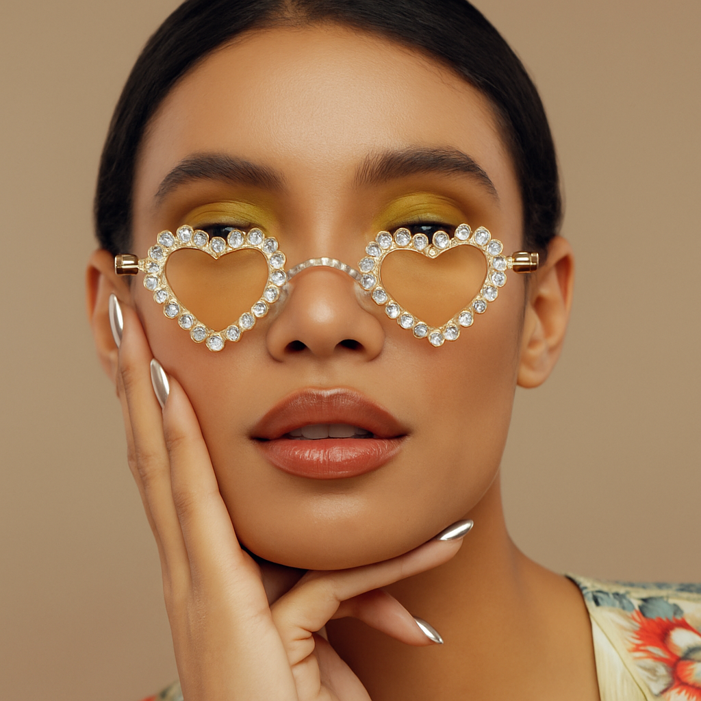 Heart-shaped sunglasses with crystal rhinestone trim and slim metal frame. Mid-size fit—not oversized—for a chic, comfortable look. UV400 gradient lenses offer sun protection. Lightweight and perfect for everyday glam, festivals, or statement outfits.
