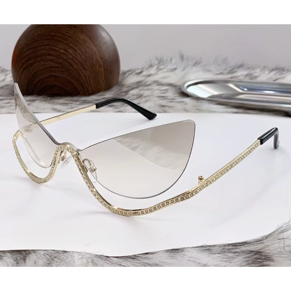A sharp reinterpretation of the classic cat-eye, designed to command attention without excess. The rimless silhouette is paired with a sculpted metal frame and precision-set rhinestone detailing, delivering a refined statement with edge.