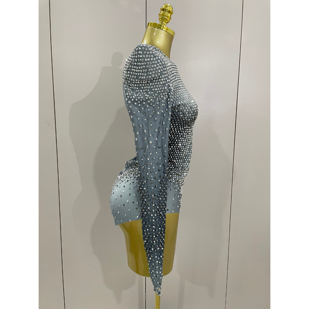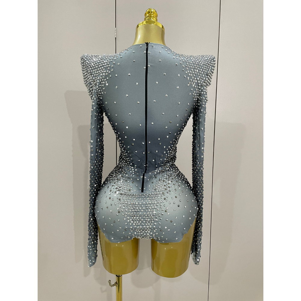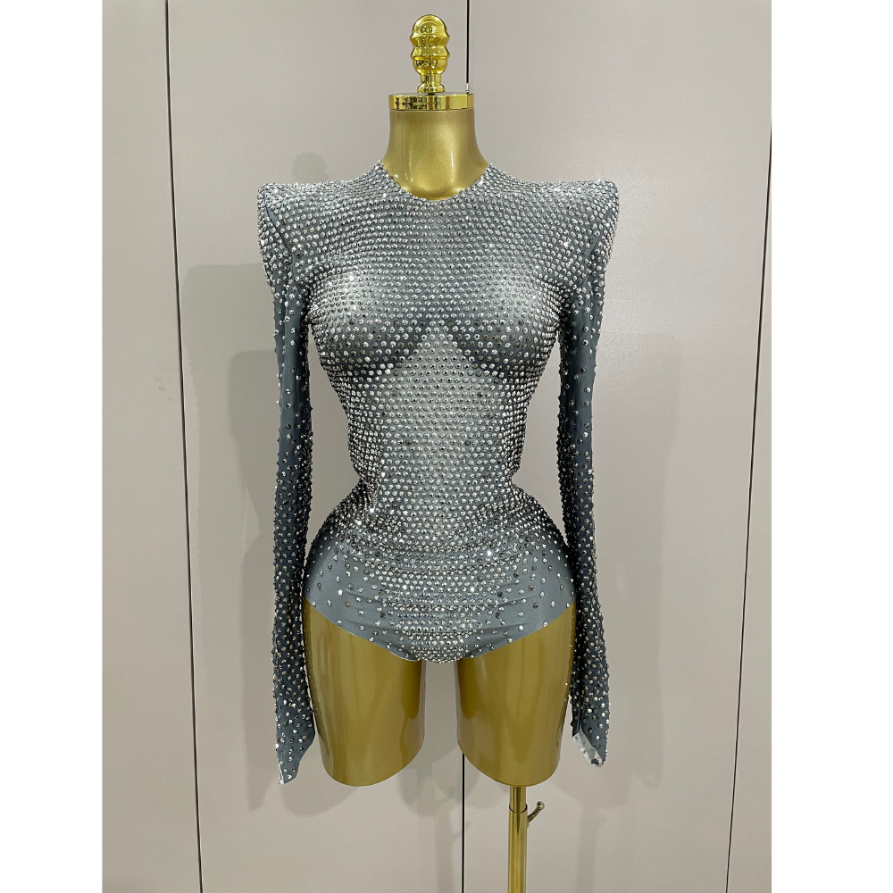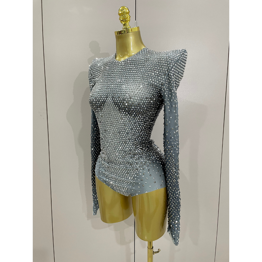 A sculptural stage-ready bodysuit engineered with precision placement of faceted rhinestones over a power-stretch mesh base. Designed for maximum sparkle under lights, this look features sharply padded shoulders, a high neckline, and a second-skin silhouette that hugs the body from wrist to hip. The sleeve and hip panels are elongated for a fluid, dramatic finish. Invisible zip back closure. Style with fishnets, boots, or layered under oversized outerwear for editorial moments.